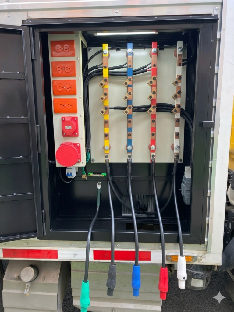Equipada con un tablero eléctrico completo con tomas a 110V y 220V listas para conexion inmediata. Incluye barraje independiente para distribución en 220V y sistema de conexión mediante de Camlocks para eventos,obras, industria garantizando una instalacion segura, organizada y de alta capacidad